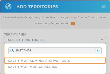 First, add a new territory from Mapline’s repository, then type EAST TIMOR into the search bar. Select EAST TIMOR ADMINISTRATIVE POSTS, and you’re good to go!